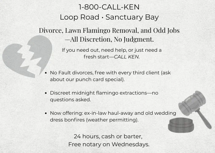 You can call 1-800-KEN for a quickie divorce (he’s got a punch card for every third client—free lawn flamingo removal included),